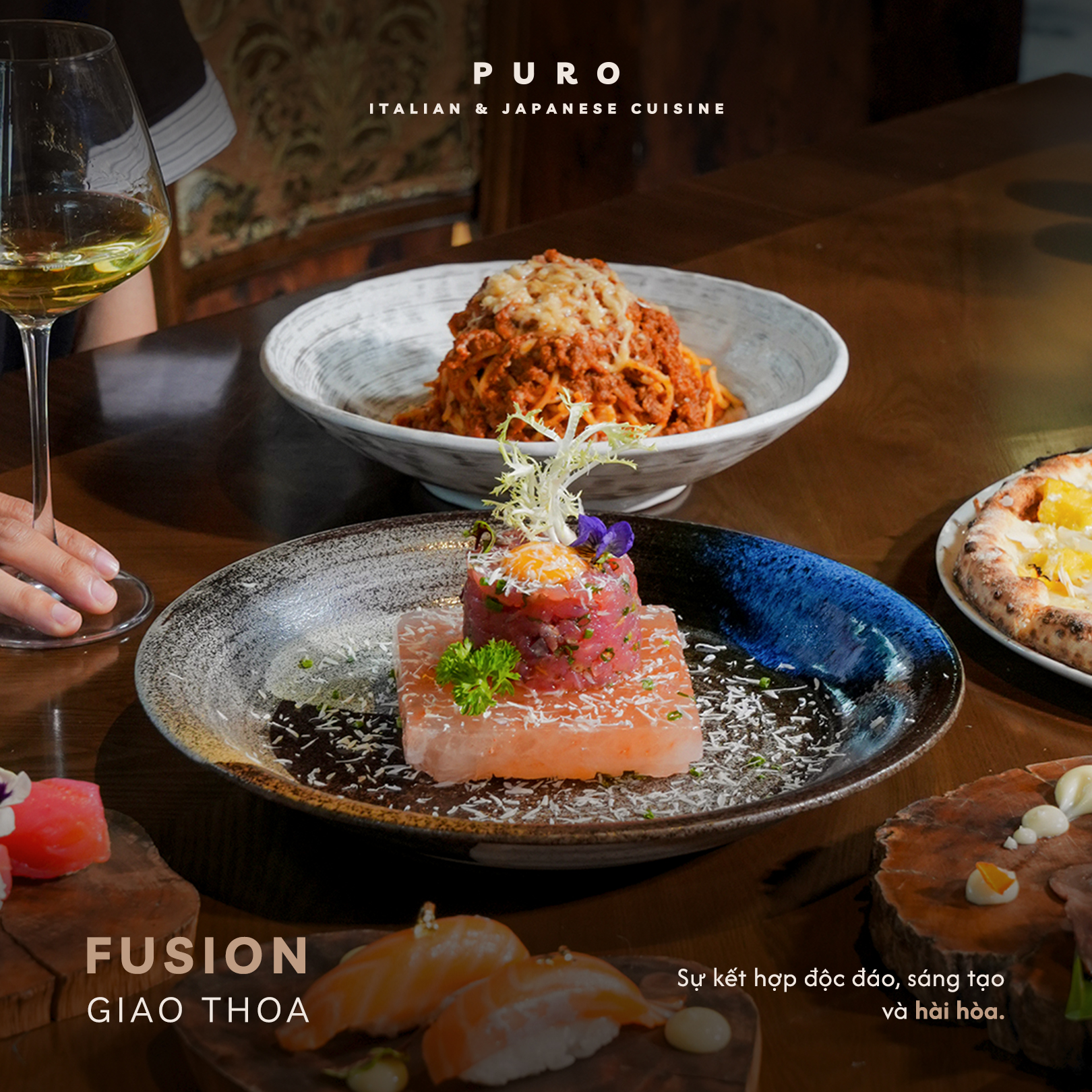 Chìa khóa cho một buổi tiệc tập thể đáng nhớ tại Puro chính là sự cộng hưởng giữa ẩm thực Ý - Nhật đặc sắc và những dòng vang được tuyển chọn kỹ lưỡng